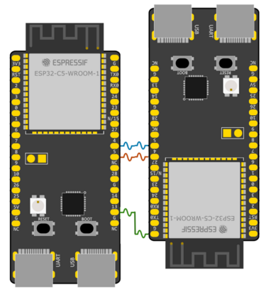 To link NODE 1 and NODE 2 so they can communicate over UART, connect the following pins directly between the two ESP32-C5 boards: